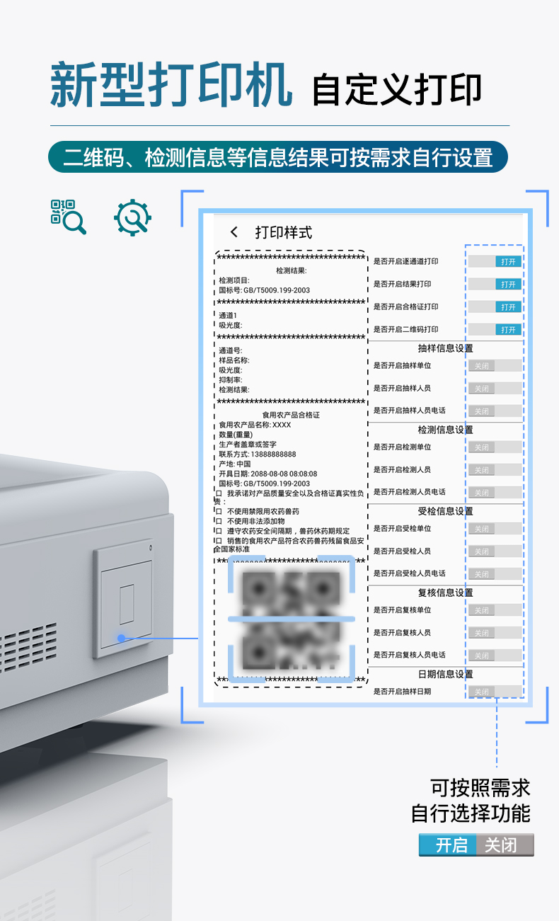 | 儀器采用手提式一體化系統(tǒng)檢測技術(shù),將分光光度模塊、數(shù)字化管理模塊、無線通訊模塊高度集成于一體,支持檢測200種食品安全檢測項目,同時預(yù)留升級檢測方法。 | 儀器檢測模塊標(biāo)準(zhǔn)化、智能化,檢測項目可隨意自由組合。檢測箱體內(nèi)置多個標(biāo)準(zhǔn)檢測單元,檢測模塊可以調(diào)整配置。 | 顯示屏幕:儀器采用10.1英寸豎向液晶觸摸屏顯,搭配運(yùn)行安卓智能操作系統(tǒng),主控芯片采用ARM Cortex-A7,RK3288/4核處理器,主頻1.88Ghz,操作方便,性能更強(qiáng)。 | 檢測通道:≥12通道;采用精密旋轉(zhuǎn)比色池設(shè)計,使用同芯片同光源校準(zhǔn)精度,解決不同光源之間的誤差值,更加準(zhǔn)確**。(1-12通道間誤差0.1%,***:**202022821055.2) | 儀器光源:高精度進(jìn)口四波長冷光源,每個通道均配置 410、520、590、630nm 波長光源,標(biāo)配**的光路切換裝置,專利光路切換功能可實現(xiàn)64波長,并且所有檢測項目可實現(xiàn)所有通道同時檢測。 | 設(shè)備可一鍵校準(zhǔn),自動保存校準(zhǔn)數(shù)據(jù),自動對比校驗,得到精準(zhǔn)光源,采用Android SP存儲數(shù)據(jù),光源數(shù)據(jù)永不丟失,方便每一次使用。 | 通訊接口:配備無線通信模塊、可選配4G(APN)通訊模塊和藍(lán)牙傳輸,同時具有雙USB接口以及RJ45網(wǎng)線接口,可以多方式實現(xiàn)數(shù)據(jù)保存及數(shù)據(jù)傳輸。 | 存儲方式:支持U盤存儲,標(biāo)準(zhǔn)USB接口,免驅(qū)動安裝。檢測結(jié)果存儲容量20萬條以上,可生成Excel表格進(jìn)行拷貝,并具有登錄保護(hù)功能。 | 智能化操作系統(tǒng): | 1)操作系統(tǒng):儀器可在同一檢測界面自動對應(yīng)相關(guān)檢測通道,一次性選擇1-12個樣品名稱,無需退出界面,節(jié)省操作時間。并可以對每個通道屬性和樣品信息單獨(dú)進(jìn)行編輯,例如送檢單位、人員,檢測人員等,打印時勾選打印顯示。 | 2)數(shù)據(jù)集成系統(tǒng):設(shè)備首頁自動匯總分析檢測數(shù)據(jù),包含:周檢測數(shù)據(jù)、月檢測數(shù)據(jù),全部檢測總數(shù)量,均包含檢測總數(shù),合格數(shù),不合格數(shù),以及相關(guān)柱形分析圖,各項檢測數(shù)據(jù)一目了然,無需電腦查詢,更加快捷直觀。 | 3)數(shù)據(jù)庫系統(tǒng):十幾項數(shù)據(jù)庫分類管理儀器:包含項目類型、項目數(shù)據(jù)、檢測數(shù)據(jù)、歷史記錄、國標(biāo)信息、曲線信息、采樣信息、檢測信息、受檢信息、復(fù)核信息、圖表信息、光源校準(zhǔn)信息、打印樣式信息、樣品庫信息等等,數(shù)據(jù)庫之間互相協(xié)調(diào)聯(lián)動保證數(shù)據(jù)的真實完整性。同時產(chǎn)品數(shù)據(jù)庫以及歷史檢測記錄支持一鍵檢索功能。 | 4)限量規(guī)判系統(tǒng):具有限量查詢、添加物質(zhì)合規(guī)判定系統(tǒng)。檢測出結(jié)果后,系統(tǒng)自動調(diào)用系統(tǒng)數(shù)據(jù)庫中相關(guān)國標(biāo)進(jìn)行比對判定,客觀顯示判定結(jié)果是否合格。 | 5)項目預(yù)設(shè)系統(tǒng):儀器具有任務(wù)預(yù)設(shè)模塊,一鍵提前預(yù)設(shè),給出方便快捷的新檢測方案,每一個任務(wù)分別可以設(shè)置不同的樣品、批次、編號、來源、備注、抽樣信息、檢測信息、受檢信息、復(fù)核信息等更多信息。樣品送檢時一鍵調(diào)取保存信息,并可多次調(diào)取,大大提高檢測效率。 | 6)數(shù)據(jù)監(jiān)管系統(tǒng):同步對接監(jiān)管平臺,數(shù)據(jù)可局域網(wǎng)和互聯(lián)網(wǎng)數(shù)據(jù)上傳,檢測結(jié)果可選擇直接傳至食品安全監(jiān)管平臺。進(jìn)行區(qū)域食品安全監(jiān)管及大數(shù)據(jù)分析處理與數(shù)據(jù)統(tǒng)計,檢測區(qū)域食品安全長短期動態(tài),達(dá)到食品安全問題預(yù)估、預(yù)警。 | 7)打印系統(tǒng):內(nèi)置全新打印機(jī),新創(chuàng)自定義打印方式,可按需靈活勾選控制:產(chǎn)品合格證(國家農(nóng)業(yè)部標(biāo)準(zhǔn)要求),二維碼,抽樣信息、檢測信息,受檢信息、復(fù)核信息、抽樣日期、檢測日期等信息的打印。 | 供電模式:儀器交直流兩用,直流12V供電,可連接車載電源,可配6ah大容量充電鋰電池,電量可實時顯示,方便戶外流動測試。 | 儀器加入遠(yuǎn)程升級功能,可定向分客戶分儀器更新,開機(jī)后自動更新,客戶無需任何操作,即可升級全新項目。做到了無需退換機(jī)器即可實現(xiàn)實時遠(yuǎn)程升級檢測儀器。 | 設(shè)備尺寸:(長*寬*高)440*300*180mm | 儀器加入遠(yuǎn)程升級功能,可定向分客戶分儀器更新,開機(jī)后自動更新,客戶無需任何操作,即可升級全新項目。做到了無需退換機(jī)器即可實現(xiàn)實時遠(yuǎn)程升級檢測儀器。 |