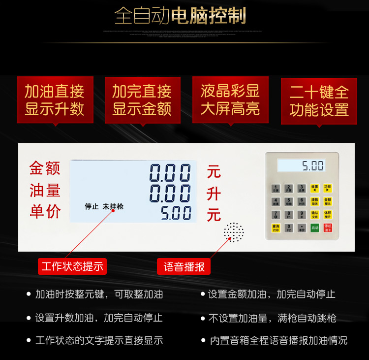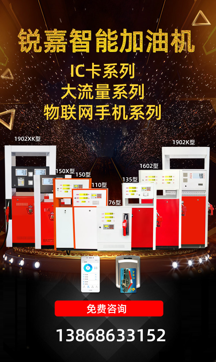 銳嘉新型雙槍加油機IC卡加油機1902XK型是一款加油站防爆汽油插卡加油機,可加柴油和汽油,750W大功率,流量每分鐘可達60L-100L,加油機內部采用軟活塞流量計和防爆組合泵裝置,安全更放心!